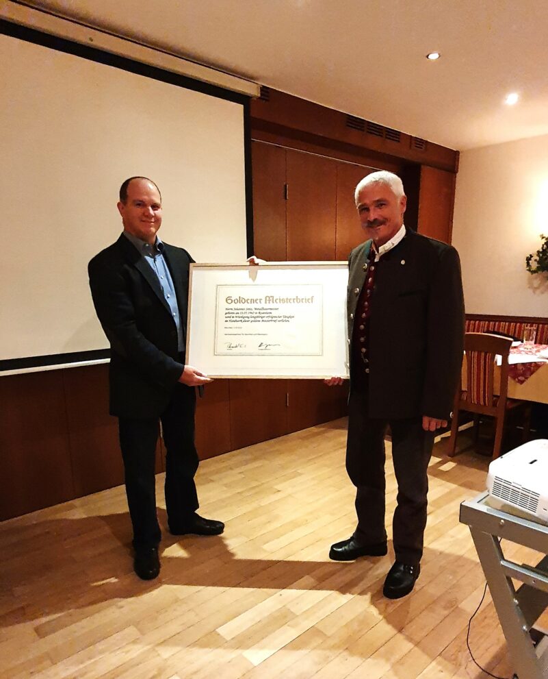 Nach der Verabschiedung des Haushalts wurde Johannes Seitz aus Schonstett mit dem Goldenen Meisterbrief geehrt. Der Goldene Meisterbrief wird für 35 Jahre Meistertitel und 35 Jahre selbständige Tätigkeit im Handwerk als Handwerksmeister überreicht. Die Dorfschmiede feierte bereits 2019 ihr 555-jähriges Bestehen.