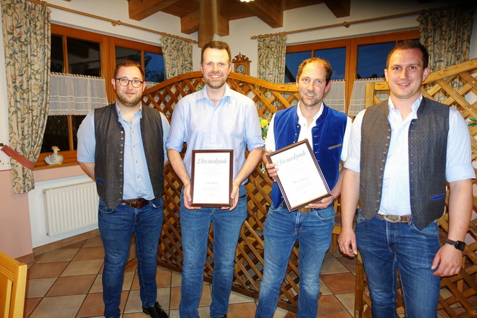 Peter Thaurer junior und Christian Schnaiter konnten bei der JHV der Jungbauernschaft Prien und Umgebung für ihre zwei Jahrzehnte der Mitgliedschaft und Mithilfe eine Urkunde sowie eine Wein- und Speck-Brotzeit von den Vorständen Florian Krempl und Fredi Köhler entgegennehmen.