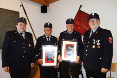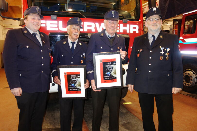Bildbeschreibung: Eine Ehrenurkunde für 60-jährige Mitgliedschaft im Feuerwehrverein erhielten Thomas Speicher und Josef Mühlberger (in der Mitte von links) aus den Händen vom Vorstand Matthias Lengg (links) und von Kommandant Günther Braun. Weiteres Bild von der Ehrung für 40 Jahre aktiver Dienst bei der Freiwilligen Feuerwehr, von links Vereinsvorstand Matthias Schlechter, die Geehrten Franz Mühlberger und Alexander Hagl sowie Kommandant Günther Braun.