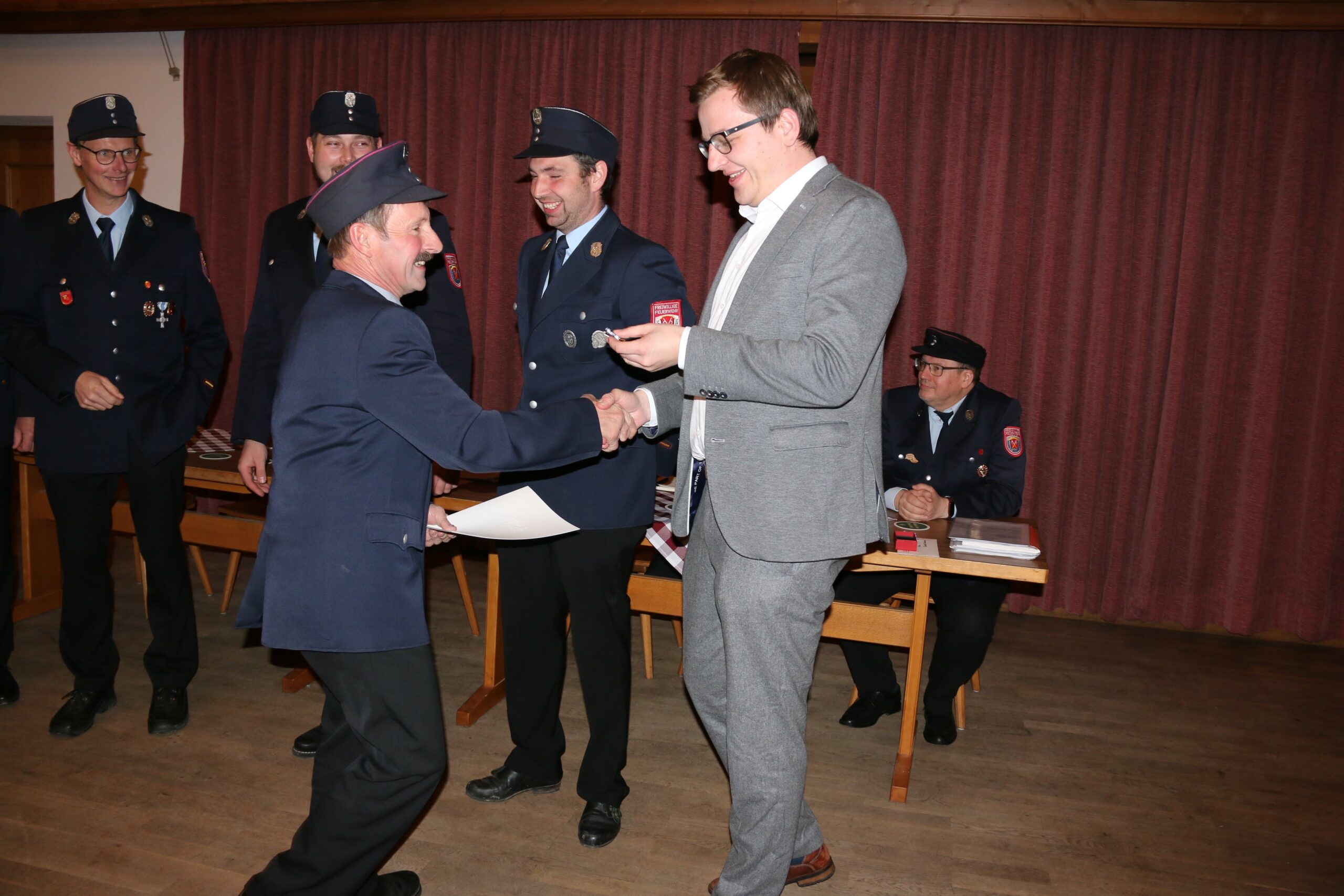 Rupert Hamberger bei seiner Ehrung für 4o jährigen Dienst. Bürgermeister Christoph Schneider überreicht ihm ein Präsent.