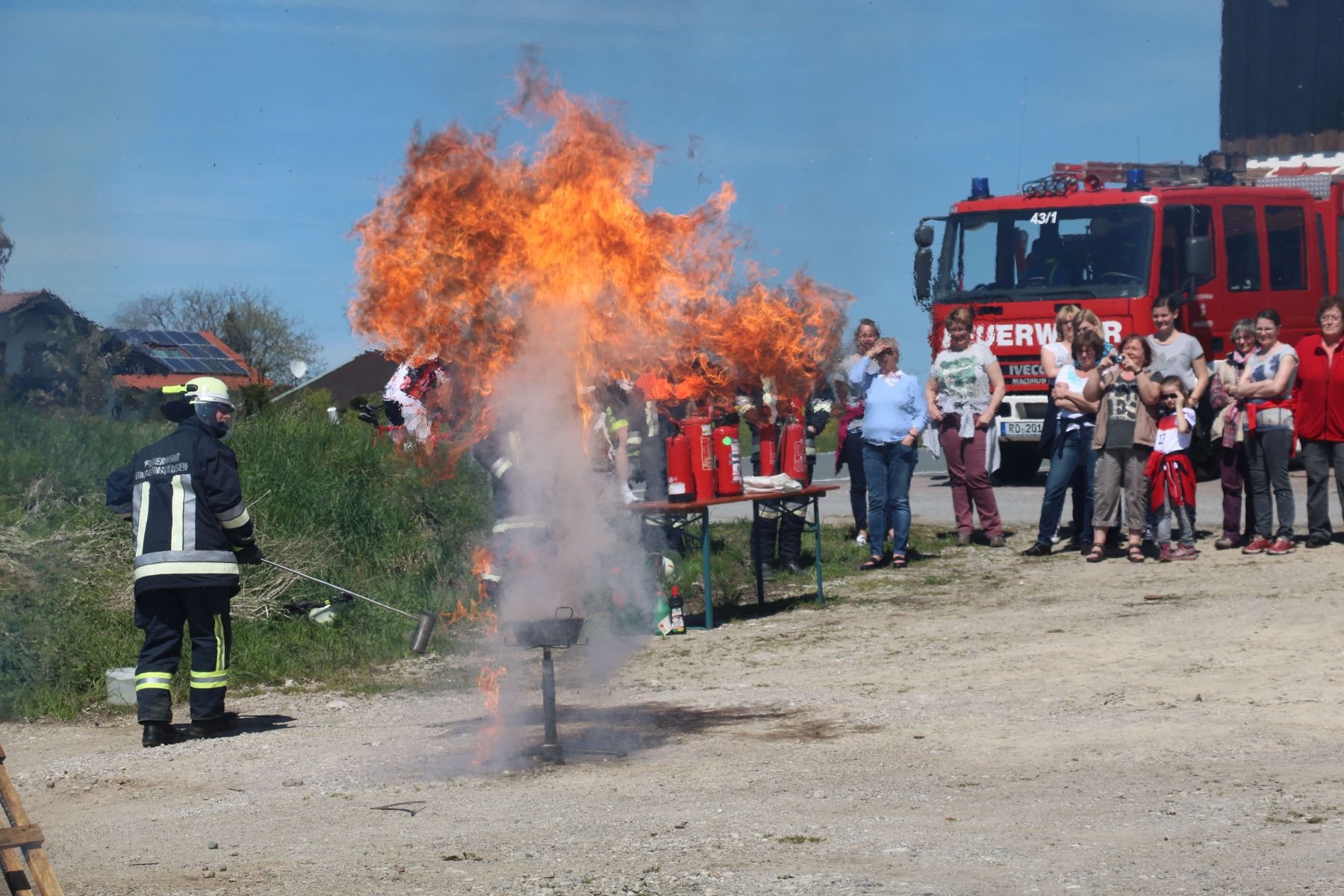Was tun, wenn’s brennt? Die Umrathshauser Frauen wissen Bescheid! Kommandant Martin Dialler mit seinen Männern zeigte an einem ganzen Nachmittag allen, wie man einen Feuerlöscher richtig bedient, wie man einen Kleinbrand ablöscht und was beim Brand einer Friteuse zu tun ist. Knapp 40 Frauen fanden sich im Umrathshauser Feuerwehrhaus ein, um sich über die Gefahren des Feuers und Unfälle im Haushalt zu unterrichten. Auf einen theoretischen Teil im Feuerwehrhaus folgte viel Praxis mit Feuer, Rauch und Wasserdampf. Alle, die mitmachen wollten, durften einen Kleinbrand mit dem Pulverlöscher ablöschen.