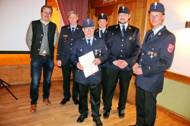 Der  Verein gab 15.000.-€ für die neue Garage aus – das informierte Kassier Thomas List. Viele Arbeits- und Sachleistung wurden in Spendenform gegeben, daher der günstige Bau. Trotz eines Minus von rund 11.000.-€ ist die Vereinslage gesichert. Die Richtigkeit des Zahlenwerkes bestätigte Revisor Peter Schaber, die Entlastung war einstimmig. Anton Schneebichler zog eine positive Bilanz für den Verein sowie die aktiven Wehrmänner. „Wir gehören zusammen“ –  meinte er. Dies seit mehr als 150 Jahren. Das mit den Veteranen und dem Sportverein geplante Fest, welches auch den Zusammenhalt wider geben sollte, musste ausfallen. Zum 155. Jahrtag wollen wir dies in kleiner Form nachholen mit einem Festtag am Marktplatz, so Schneebichler. Kreisbrandmeister Franz Aichinger verwies auf die Zusammenarbeit über die Gemeindegrenzen und mit dem Kreisverband. Die zentrale Anschaffung gesonderter Einsatzfahrzeuge wurde festgelegt. An Martin Knoll wurde durch Martin Gruber, mitverantwortlich für die Arbeit im Kreisverband, für 40 Jahre aktiver Feuerwehrdienst, eine hochverdiente Ehrung übergeben. Das fachlich-technische Wissen des aktiven Feuerwehrler, aber auch seine bescheidene Zurückhaltung, prägen seine Mitarbeit. Den Glückwünschen schlossen sich    Bürgermeister, Vorstand und Kommandant mit einem Geschenk an. Herzlicher Applaus der Versammlungsteilnehmer galt den Fahnenträgern Wolfgang Scherer und Franz Bichler, sowie Kommandantenstellvertreter Hermann Kruckenhauser, Andreas Gar, Thomas Weherer. Für 25 Jährige Mitgliedschaft wurden 13 Personen ausgezeichnet, darunter Maria Kindsmüller, die als erste Frau (1996) dem Verein beitreten konnte, was bis dahin ausgeschlossen war. Für  40 Jahre wurden acht Mitglieder geehrt, Sepp Feuerer, Franz Holzner, Andreas Perret, Franz Thanner und Hans-Jürgen Tremmel waren von den 15 geehrten für 50 jährige Treue anwesend, sie erhielten die Ehrennadel.