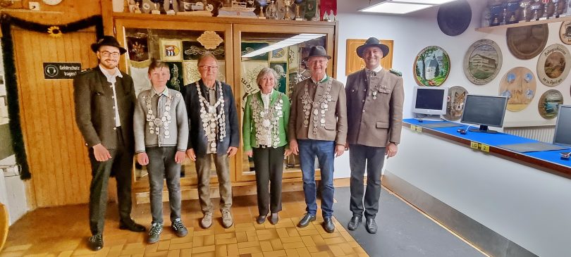 Auf dem Bild Könige: v.l. 2. Schützenmeister Georg Gmeiner, Jugendkönig Dominik Besten, Pistolenkönig Tankred Haase, Gewehrkönig Renate Pfaffenberger, Traditionskönig Johann Fischer sen. , 1. Schützenmeister Florian Wunderle