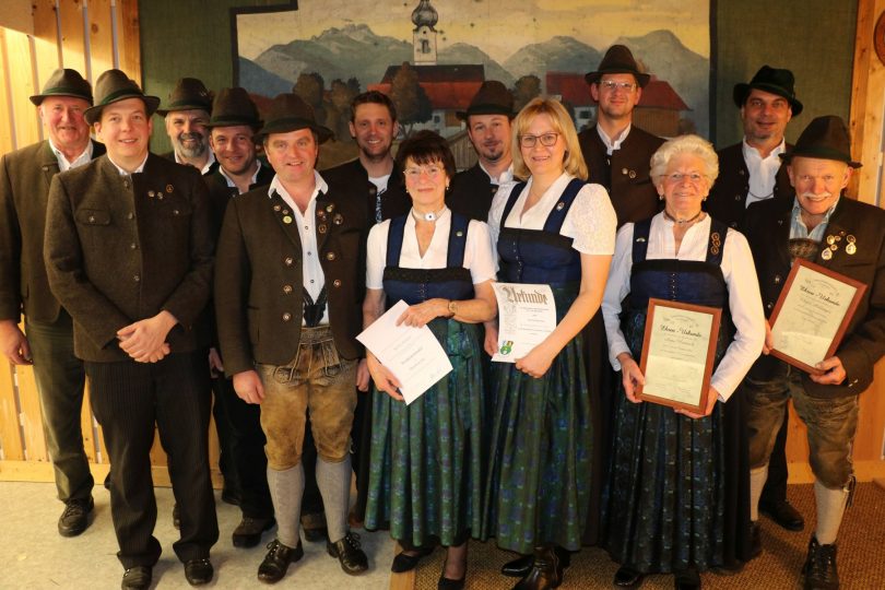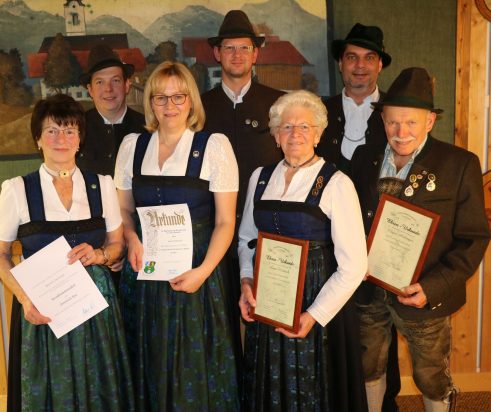 Gauschützenmeister Bernhard Brehmer übergab den beiden zusätzlich das Ehrenzeichen des bayerischen und des deutschen Sportschützenbundes für ihre 60-jährige aktive Vereinsmitgliedschaft. Kassenfrau Marianne Heinrich erhielt das Ehrenzeichen des Bezirks Oberbayern die Silberne Gams, Ilse Heinrich das Abzeichen des BSSB als Anerkennung ihrer Verdienste um den Verein, Sepp Heinrich das kleine Edelweiß in Silber für seine Verdienste um die Jugendarbeit. Den Chiemgauadler des Schützengaus in Silber steckte Gauschützenmeister Brehmer Schützenmeister Sepp Staudacher und Sportleiter Sepp Bauer an die Schützenjoppe. Das silberne Fahnenehrenzeichen des BSSB überreichte er an die Fahnenabordnung der „Chiemgauadler“ Sigi Steinberger, Florian Stein, Albert Pichl und Fridolin Pichl.