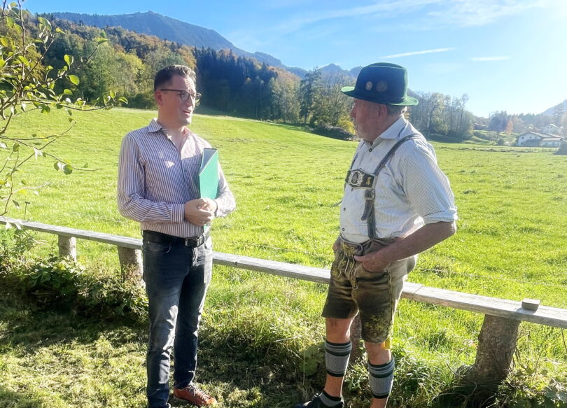 Foto: Hötzelsperger – Oberbayerns Volksmusikpfleger Leonhard Meixner (li.) bei seinem Besuch auf dem Samerberg bei Ehrenvorstand Hans Sattlberger vom Trachtenverein Grainbach mit der Hochries und deren Drei-Seiten-Almen im Hintergrund.