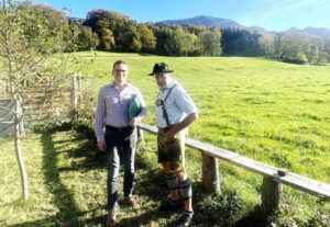 Oberbayerns Volksmusikpfleger Leonhard Meixner (li.) bei seinem Besuch auf dem Samerberg bei Ehrenvorstand Hans Sattlberger vom Trachtenverein Grainbach mit der Hochries und deren Drei-Seiten-Almen im Hintergrund.