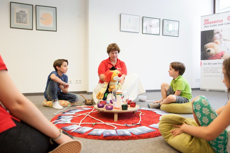 Wenn ein Familienangehöriger aus dem Leben gerissen wird, ist nichts mehr wie es vorher war. Dann brauchen insbesondere Kinder Hilfe, denn oft trauen sie sich nicht zu trauern, weil sie den verbliebenen Elternteil schonen möchten oder weil sie in ihrer Klasse nicht auffallen wollen. Hinzu kommt, dass ihre Freunde oft nicht wissen, wie sie mit der Situation umgehen sollen und sich zurückziehen. Ehrenamtliche Trauerbegleiterinnen und Trauerbegleiter der Johanniter können den Kindern dann Mut für die Zukunft schenken. Bei Lacrima, dem Zentrum für trauernde Kinder in Rosenheim, finden Kinder und ihre Angehörigen Raum und Zeit für Trauer und erhalten Impulse, ihre Trauer auf unterschiedliche Art auszudrücken. „In den Gruppenstunden finden die Kinder auch ganz viel Verständnis,“ erzählt Dr. Beate Düntsch-Hermann, die mit ihrem Team seit knapp 10 Jahren Familien durch die Trauer begleitet und unterstützt, „hier spüren die Kinder, dass sie nicht alleine sind und es andere Kinder und Familien gibt, die das Schicksal teilen.“