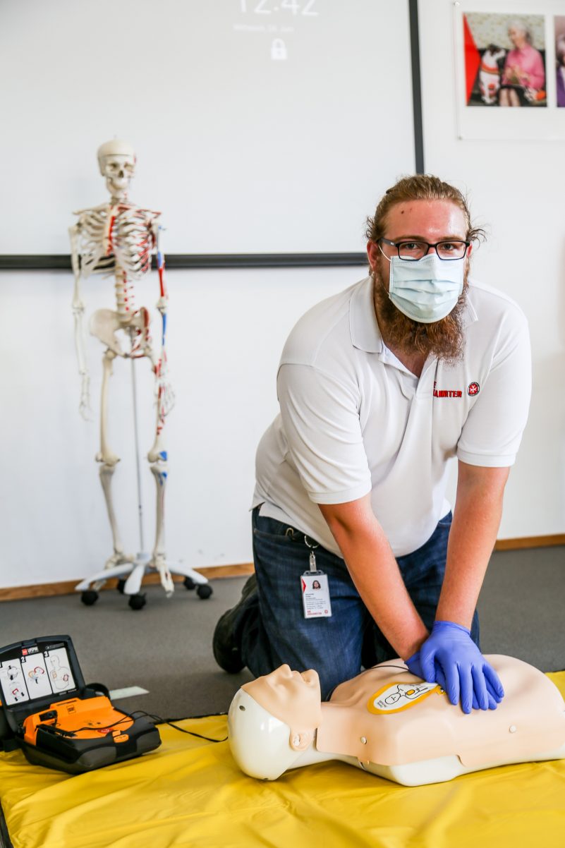 „Wir sorgen in unseren Räumen für die Einhaltung der Sicherheitsbestimmungen wie die Abstandswahrung durch eine verringerte Teilnehmerzahl und intensivierte Desinfektion“, sagt Sven Aschenbrenner von den Johannitern in Wasserburg. Auf Grund der reduzierten Teilnehmerzahl und des größeren Aufwands liegen die Kursgebühren derzeit bei 50 Euro. Um eine entsprechende Erste-Hilfe-Ausbildung in Corona-Virus-Zeiten zu gewährleisten, stehen zu Beginn Hygienemaßnahmen für eine sichere Kursdurchführung im Fokus: Neben den allgemeinen Abstandsregeln, richtigem Händewaschen und Händedesinfektion werden die Husten-Nies-Etikette sowie das richtige Tragen von Mund-Nasen-Masken erklärt.