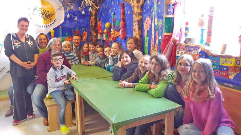 Fotos: Petra Wagner – Gemeinsam mit Sonja Werner, Leiterin des Waldorfkindergartens, Sabine Hertkorn, Erzieherin des Kinderhorts Wirbelwind sowie den Kindern des Horts setzte sich Erster Bürgermeister Jürgen Seifert zusammen, um die Vorbereitungen, die in vollem Gange sind, zu besprechen.