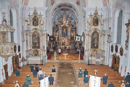 100 Jahre Oberer Lechgau-Verband 1920 – 2020, wie sollte dieses Jubiläum mit vielen Gästen aus den Gauvereinen, Nachbargauen sowie aus Nah und Fern vor mehr als einem Jahr schon gefeiert werden. In der Stadtpfarrkirche St. Martin in Marktoberdorf fand nun unter Corona-Bedingungen mit nur wenigen geladenen Gästen ein feierlicher Gottesdienst am traditionellen Gaufestwochenende statt. 1. Gauvorstand Walter Sirch begrüßte dazu die Vertreter der Gauvereine mit ihren Vereinsfahnen, Gaustandarte, Gauausschuss und Gauehrenmitglieder, sowie Gauehrenvorstand und 1. Vorsitzender des Bayerischen Trachtenverbandes Max Bertl mit Stellvertreter Günter Frey. Dieser Gottesdienst soll Dank für viele schöne Stunden in der Gemeinschaft im Oberen Lechgau-Verband in den vergangenen 100 Jahren sein. Es gab seit dieser Zeit viele Männer und Frauen, die mit Idealismus das Brauchtum und die Traditionen weitergegeben haben.