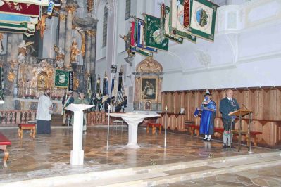 Das Dodle der Gaustandarte, D’ Neuschwanstoaner Stamm Füssen, wollte zum 100 jährigen des Oberen Lechgau-Verbandes ein Fahnenband überreichen. Dieser Gottesdienst war nun ein würdiger Rahmen, dies zu tun. Vorstandssprecher Richard Hartmann bedankte sich für 100 Jahre Verbundenheit der Trachtlerinnen und Trachtler im Oberen Lechgau-Verband und hängte das Band an die Gaustandarte, welches Pfarrer Karl Mair dann segnete. Pfarrer Mair ging in seiner Predigt auf das Gleichnis der Brotvermehrung ein – auch wir können Gutes tun, mit dem was wir haben. Die Zusammengehörigkeit und die Gemeinschaft – dafür stehen seit 100 Jahren engagierte Frauen und Männer. Mit der Achtsamkeit für einander lebe die Trachtensache.