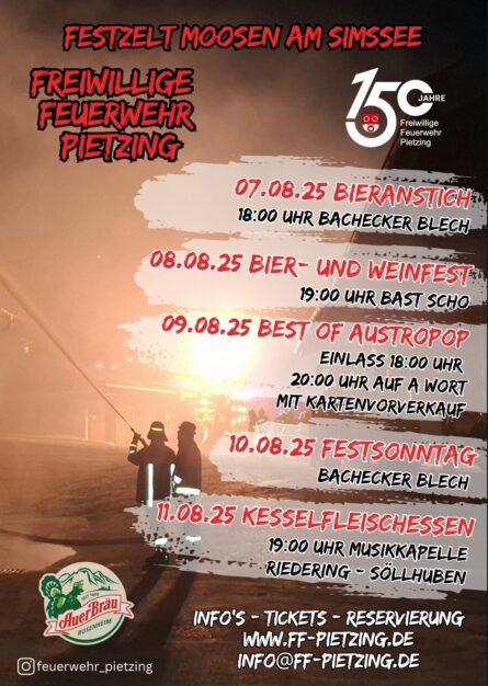 Die Freiwillige Feuerwehr Pietzing feiert vom 7. bis 11. August 2025 ihr 150-jähriges Gründungsjubiläum in Moosen am Simssee.