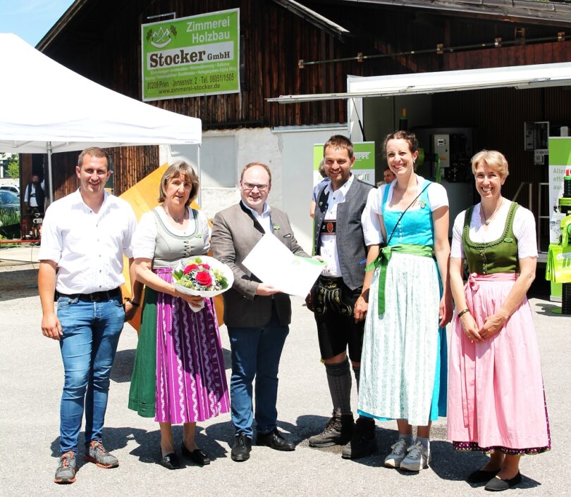 Der Reinerlös vom Tag der offenen Tür wird von der Zimmerei Stocker an die Wasserwacht Prien-Rimsting gespendet. Zu den Besuchern gehörten auch Kreishandwerksmeister Rudolf Schiller sowie Thomas Pichler von der Rosenheimer Zimmerer-Innung und Priens Erster Bürgermeister Andreas Friedrich, er überreichte an Zimmerei-Inhaber Markus Stocker eine Urkunde mit Auszeichnung zum „Umweltpakt“
