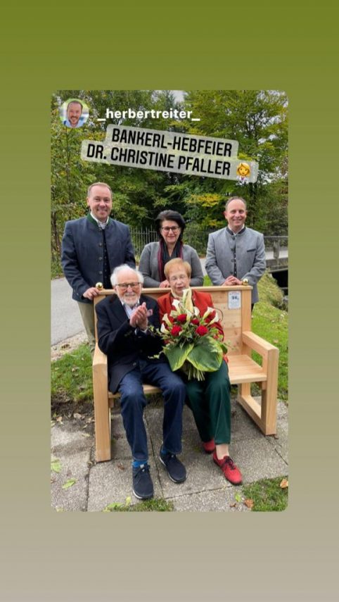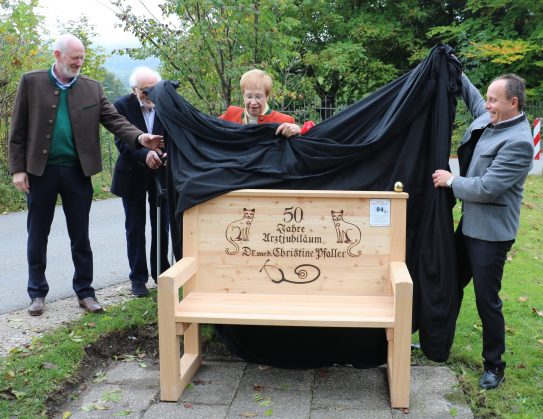 Seit 50 Jahren ist Dr. Christine Pfaller „Ärztin aus Leidenschaft“, seit 37 Jahren betreibt sie ihre Praxis in Frasdorf. Dabei stammen ihre Patienten nicht nur aus dem Ort selbst, sondern auch aus dem Umkreis, aus Aschau, Höhenmoos, Wildenwart und vom Samerberg. Zusätzlich ist Dr. Pfaller in der Ausbildung der künftigen Ärzte tätig und bringt ihnen mit viel Geschick und Einsatz die Wahrheit über die Arbeit eines Landarztes bei. Das Goldene Arzt-Jubiläum war für den Frasdorfer Gemeinderat Anlass genug der beliebten Ärztin etwas ganz besonderes zu schenken. Doch was schenkt man einem Menschen, der eigentlich alles hat? Nach eingehenden Beratungen und einer geheimen Absprache zwischen den beiden Nachbarbürgermeistern Daniel Mair und Simon Frank, sowie dem Aschauer Tourismuschef Herbert Reiter und Rosi Hell aus dem Team um Dr. Pfaller einigten sich alle darauf, ein neues „Dr. Christine Pfaller Bankerl“ im Bankerldorf Aschau aufzustellen.