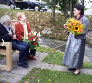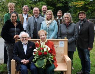 Sie waren ferner viele Jahre Bürgerin der Gemeinde Frasdorf und haben sich neben Ihrem sehr zeitintensiven und anstrengenden Beruf im Ortsgeschehen eingebracht. Als Beispiel sei hier anzuführen, dass Sie sich sogar Zeit zum Theaterspielen genommen haben. In dem Stück „Tante Rosa kommt zu Besuch” haben Sie als Postbote mit einem gelben Fahrrad und einer geliehenen Uniform mitgewirkt. Genanntes Stück haben Sie nach einem nächtlichen Notfall-Hausbesuch auf dem Samerberg noch umgeschrieben. Die Vorstellung in der Lamstoahalle habe ich mir sagen lassen, war ein voller Erfolg. Da Sie in der Gemeinde Frasdorf bei Jung und Alt bekannt und vor allem hoch geschätzt sind, hat sich der Gemeinderat der Gemeinde Frasdorf viele Monate Gedanken gemacht, wie man Ihnen eine kleine Freude anlässlich Ihres Jubiläums machen könnte. Zum Glück konnte ich letztlich Kontakt mit einer „guten Fee“ in Ihrem Haushalt aufnehmen, von der ich in Erfahrung bringen konnte, dass Sie sich eventuell über ein „Bankerl“ im Bankerldorf Aschau freuen würden. Diese Idee fand ich sowie alle Gemeinderäte perfekt! Daraufhin habe ich gemeinsam mit der guten Fee Kontakt mit der Tourist-Info Aschau i. Chiemgau aufgenommen und in Herbert Reiter einen sehr kreativen „Mitverbündeten“ gefunden, der uns einen passenden Standort zur Verfügung gestellt hat und bei der Vorbereitung dieses Termines kräftig mitgewirkt hat. Auch mein Bürgermeisterkollege aus Aschau Simon Frank hat mir ohne zu zögern die Erlaubnis zur Durchführung des heutigen Termines in seinem Gemeindegebiet zugesagt. Ich möchte mich an dieser Stelle nochmal ausdrücklich bei der Gemeinde Aschau, insbesondere bei Herbert Reiter für die Unterstützung bedanken.