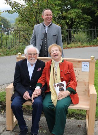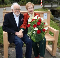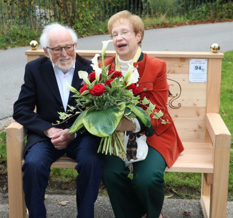 Dr. Christine Pfaller und Felix Pfaller beim Probesitzen auf der neuen Bank zum 50-jährigen Arztjubiläum