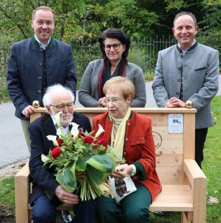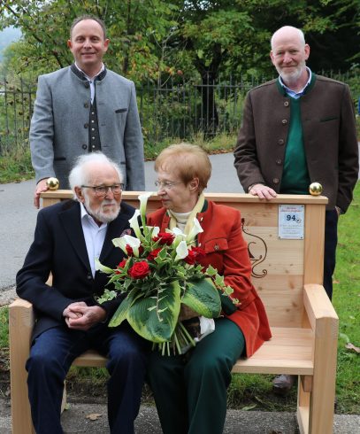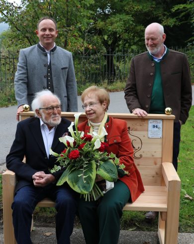 Dr. Christine Pfaller und Felix Pfaller beim Probesitzen auf der neuen Bank zum 50-jährigen Arztjubiläum mit Bürgermeister Daniel Mair (links) und dem Aschauer zweiten Bürgermeister Michael Andrelang (rechts)
