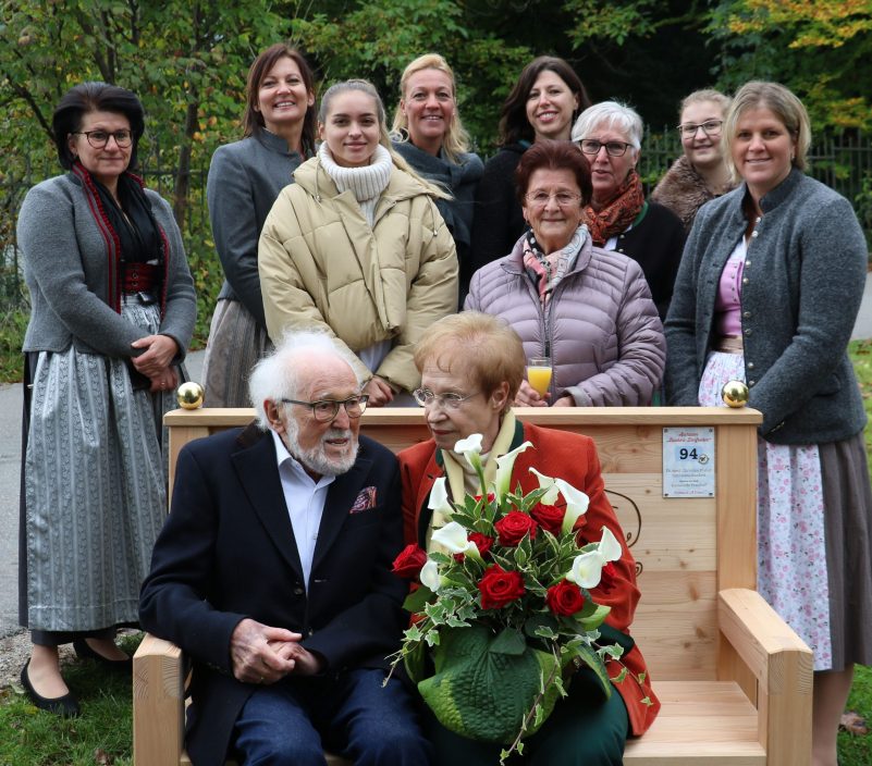 Dr. Christine Pfaller und Felix Pfaller beim Probesitzen auf der neuen Bank zum 50-jährigen Arztjubiläum mit Bürgermeister Daniel Mair (vierter von links), Altbürgermeisterin Marianne Steindlmüller (zweite von rechts) und den Frasdorfer Gemeinderäten