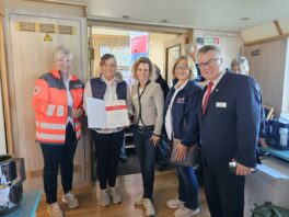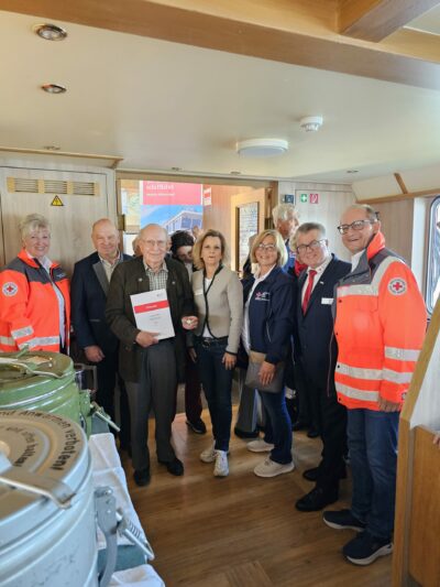 - Ehrengäste und Verantwortliche an Deck (v.l.) Annemarie Schwoshuber, BRK- Altötting, Sepp Hofer (Bezirksrat), Marianne Asam (Vertretung Landesbeauftragte BRK WuS), dahinter Sepp Hunger (Bergwacht, 2. stellv. Vorsitzender BRK-Rosenheim), Dr. Martin Rieger (BRK-Bezirksgeschäftsführer), Angelika Schorer (BRK-Präsidentin), dahinter Christian Fendt (BRK-Kreisgeschäftsführer Altötting, Birgit Knobloch (BRK Rosenheim-Organisatorin der Schifffahrt), dahinter Elisabeth Seibl-Kinzlmaier (BRK-Kreisgeschäftsführerin Ebersberg), Daniela Ludwig (MdB und Vorsitzende BRK-Kreisverband Rosenheim), dahinter Manfred Barth (BRK-Ebersberg), Marianne Asam (Vertretung Landesbeauftragte BRK WuS), Direktor Martin Schmidt (BRK-Kreisgeschäftsführer Rosenheim), dahinter Günther Graupe (BRK-Rosenheim stellv. Kreisbereitschaftsleiter), Margit Heger (BRK-Rosenheim Beauftragte WuS)