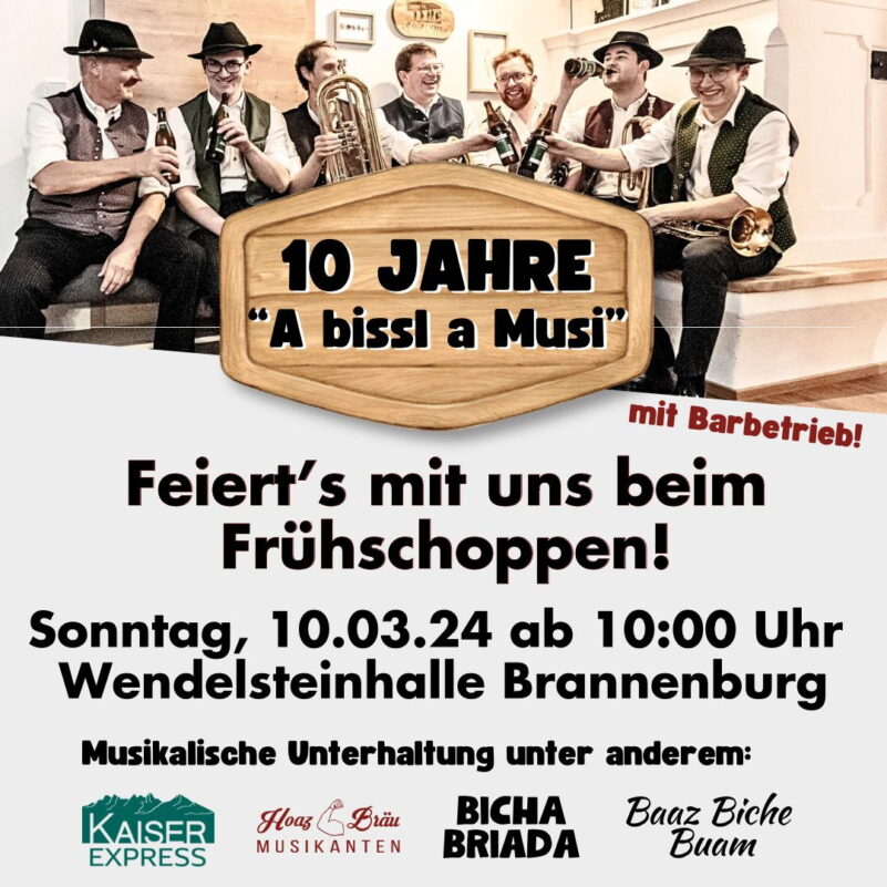 “10 Jahre A bissl a Musi” wird am Sonnntag, 10. März in der Wendelsteinhalle in Brannenburg mit einem Frühschoppen gefeiert. Beginn ist um 10 Uhr.