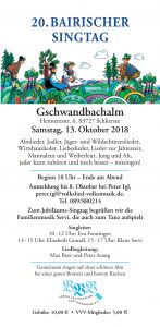 Zum zwanzigsten Bairischen Singtag lädt der Verein für Volkslied und Volksmusik e.V. (VVV) am Samstag, 13. Oktober auf die Gschwandbachalm in Schliersee ein.