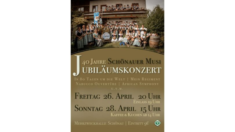 Am kommenden Wochenende, 26. und 28. April 2024, veranstaltet die Schönauer Musi zwei Jubiläumskonzerte, zu denen herzlich eingeladen wird.