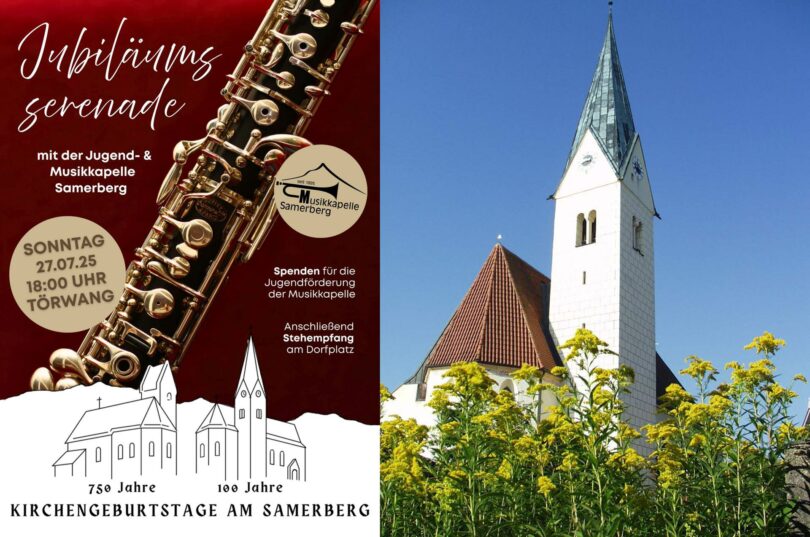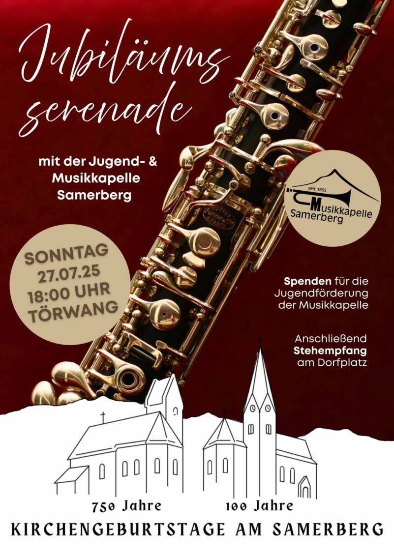 Zu einer Jubiläumsserenade wird am Sonntag, 27. Juli auf den Samerberg eingeladen. Beginn unter der Leitung von Sebastian Denzler mit der Jugend- und Musikkapelle Samerberg ist um 18 Uhr, anschließend ist Stehempfang auf dem Dorfplatz.