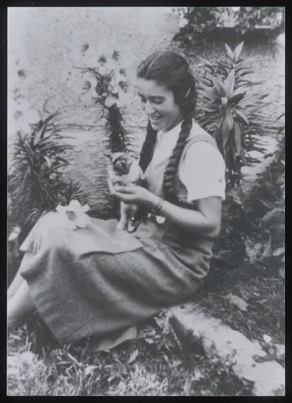Foto: Historischer Verein Rosenheim, Elisabeth Block mit einer Katze vor dem Haus der Familie Block, aufgenommen wahrscheinlich im Juni oder Juli 1939
