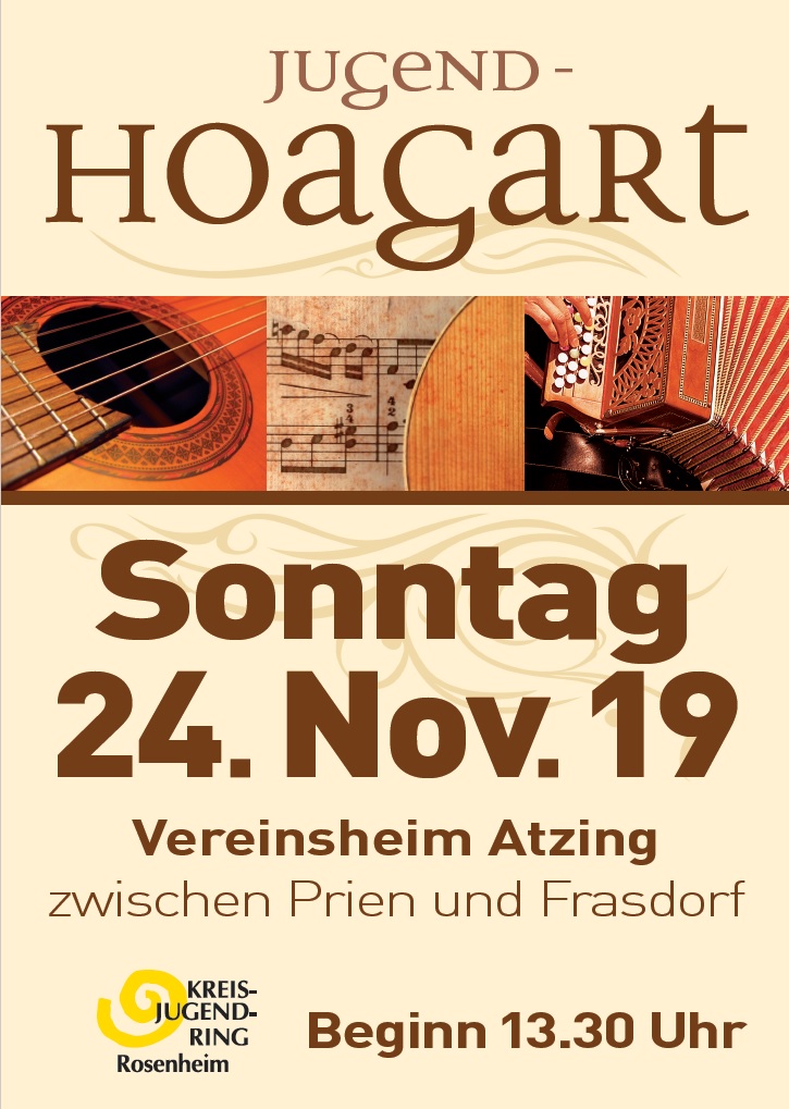 Am Sonntag, 24. November veranstaltet der Kreisjugendring Rosenheim wieder seinen traditionellen November- und Nachwuchs-Hoagascht im Vereinshaus vom Trachtenverein “Daxenwinkler” Atzing. Beginn ist um 13.30 Uhr, der Eintritt ist frei. Die Moderation übernimmt Benedikt Mies.