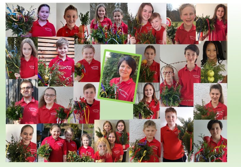 Jugendleiterin Michi Greiner animierte die Kinder über eine WhatsApp-Videobotschaft, zu Hause selbst Palmbuschen zu binden und ein Foto davon in die Gruppe zu stellen. Die Resonanz war sehr positiv und alle präsentierten ihr gelungenes Werk stolz im Vereins-T-Shirt. So entstand eine wunderbare Collage, die die Trachtenjugend auch trotz dieser schwierigen Zeit eine Gemeinschaft bleiben lässt. In Festtracht und mit ihren Palmbuschen besuchten die Kinder dann den Gottesdienst am Palmsonntag, um ihre Buschen weihen zu lassen.