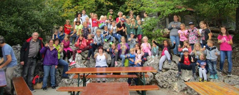 Zuschauen macht hungrig, und so gab’s erst eine kräftigende Brotzeit, ehe das Schulerloch angesteuert werden konnte. Nach einer kleinen Wanderung dort angekommen, durften die Kinder und Jugendlichen im “Wissensschatz Fledermaus” all ihre Fragen über die kleinen Höhlenbewohner loswerden: Wie alt wird eine Fledermaus (durchschnittlich drei bis sechs Jahre, im Höchstfall 30 Jahre). Was frisst sie? (Insekten). Was ist die größte Fledermaus? (Australische Gespensterfledermaus mit einer Spannweite bis 60 cm). Auch ein Film über eine Fledermausgeburt beeindruckte stark. Als Highlight hatte die Referentin noch zwei präparierte Fledermäuse dabei, welche von den Heranwachsenden neugierig betrachtet und von einigen besonders Mutigen auch gestreichelt wurde.