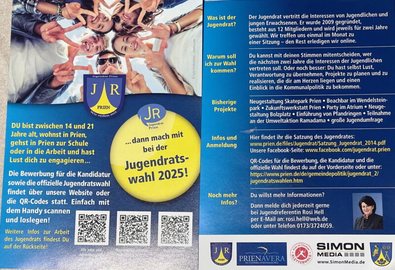 In der Marktgemeinde Prien beginnen mit Montag, 3. März die Jugendratswahlen. Bis zum 14. März läuft der Bewerbungszeitraum, der Wahlzeitraum ist dann von 24. März bis 7. April.