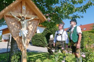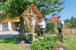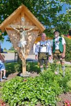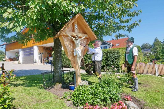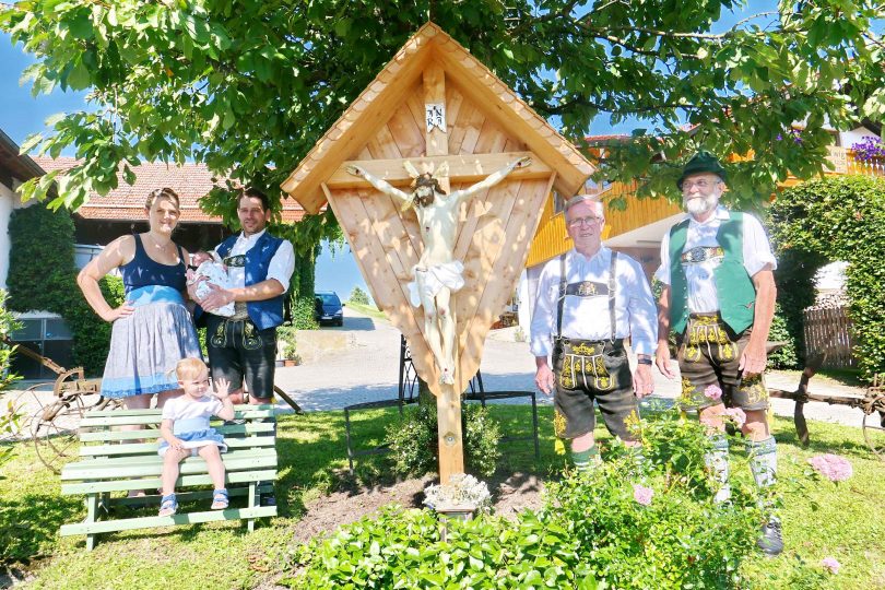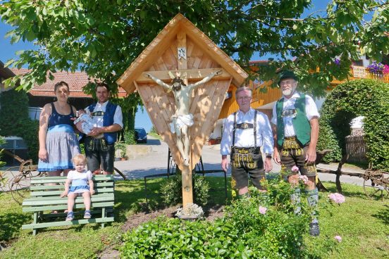 Rechtzeitig zur Geburt des Sohnes Ludwig wurde beim Kastlerhof der Familie Strohmayer in Prien-Trautersdorf das zum Haus gehörende Hofkreuz erneuert. Nachbar Jakob Bartl sowie Paul Panzer, Ehrenoberleutnant der Priener Gebirgsschützen machten sich ehrenamtlich und mit viel handwerklichem Geschick an diese Aufgabe. „Bereits im Jahr 2009 habe ich das weit über 100 Jahre alte Kreuz grundsaniert nachdem es stark beschädigt war, nunmehr habe ich den Corpus Christi neu gefaßt“, so Paul Panzer. Für die diversen Holzarbeiten einschließlich einem geschindelten Dach war Jakob Bartl zuständig, er sagte bei der offiziellen Übergabe an die Familie Strohmayer: „Jedes Hof-, Weg- oder Feldkreuz ist irgendwie anders, für dieses habe ich mir bei einer Rundfahrt um den Samerberg einige Anregungen für die Detailgestaltung geholt“. Die Familie Strohmayer bedankte sich bei den Handwerkern mit einem herzlichen „Vergelt´s Gott“.