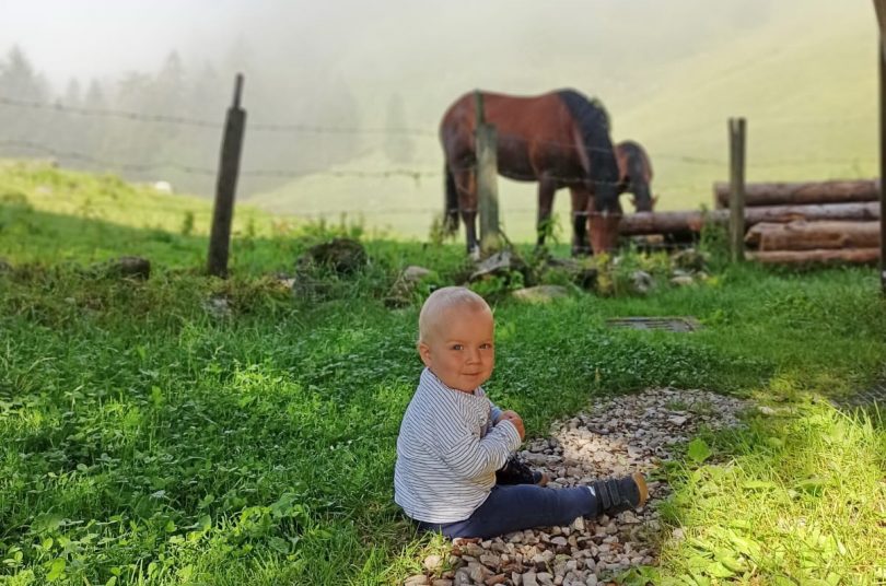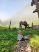 Einen sonnigen und etwas von der Morgenluft verschleierten Sonntag konnte der kleine Ludwig nahe einer Pferdekoppel bei der Oberen Arzmooshütte am Sudelfeld begrüßen – ein Naturgenuß sehr zur Freude des gut Einjährigen.