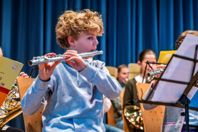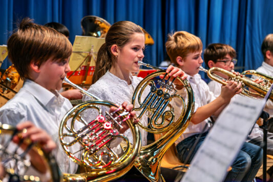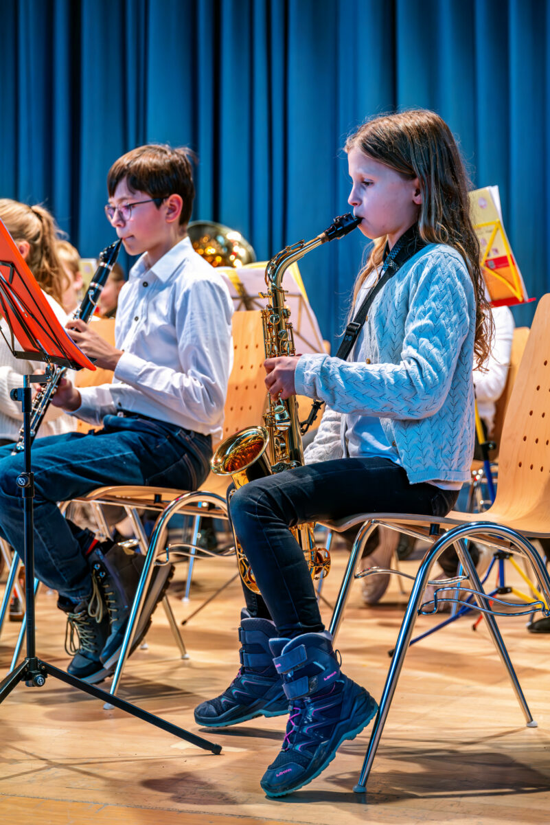 Bereits in den 3. und 4. Klassen haben Kinder die Möglichkeit, in den sogenannten Bläserklassen ihre ersten musikalischen Schritte zu machen. Unter Anleitung von qualifizierten Lehrkräften lernen sie spielerisch den Umgang mit einem Blasinstrument und erleben vom ersten Ton an, wie aufregend das Zusammenspiel in einer Gruppe sein kann.