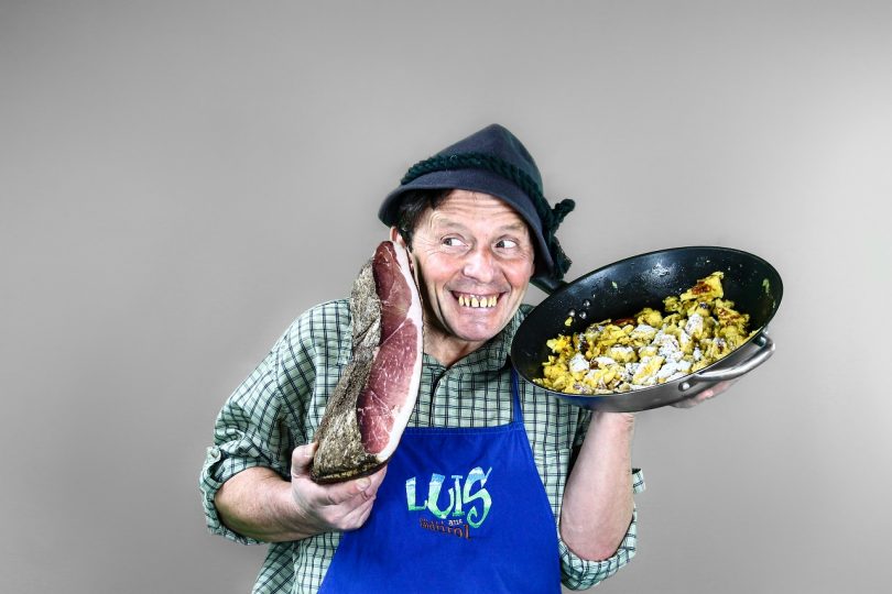 Foto: Naima-Indigo-Photography – Bildunterschrift: Kabarettvergnügen im k1: Mit einem guten Stück Speck ist für Luis aus Südtirol (Manfred Zöschg) die verrückte Welt wieder in Ordnung
