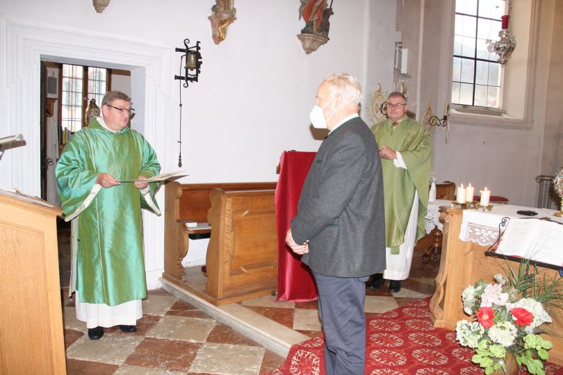 Der Schutz des arbeitsfreien Sonntags, eine Aufgabe um die sich die KAB seit Jahren zu bemüht, war Schwerpunkt der diesjährigen Jahresmesse, die witterungsbedingt vom Feldkreuz am Pfarrheim in die Pfarrkirche verlegt werden musste. Den Gottesdienst zelebrierte Domkapitular Hans-Georg Pletschacher. Das Bibelwort von der Vertreibung der Händler aus dem Tempel griff Diakon Präses Michael Wagner in seiner Predigt auf. Man muss nicht alles aufgeben, nicht jedem Verlangen hinterher laufen – nur wegen des Geldes wegen. Viele Geringverdienstverhältnisse werden entstehen, wenn man dem Druck der Wirtschaft nachgibt. Leidtragende werden dann vor allen die Frauen sein, welche in solchen Arbeitsverhältnissen angestellt werden. Zum Nachteil der eigenen Familie, von der man getrennt ist, schlechten Arbeitsbedingungen, und steigendem Druck. Die Verödung der Innenstädte wird ein weiterer Mangel sein, der dadurch entsteht, mahnte der KAB -Präses. Im Rahmen des Gottesdienstes zeichnete er,Hans Leitner für seine 38-jährige Tätigkeit als Kassier des Ortsvereins mit der roten Ehrennadel des Diözesanverbandes aus. Im Schluß- und Wettersegen so der Domkapitular gilt unsere Anteilnahme der Geschädigten und Opfer der Unwetter, die uns bedrücken.