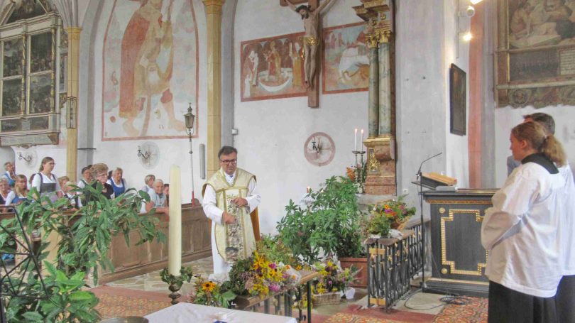 Bericht und Bilder: Thomas Schwittteck – Fotos zeigen die Abgabe der Kräuterbuschen vor dem Gottesdienst, auch der Pfarrer erwarb einen für den Pfarrhof sowie die Segnung beim Gottesdienst