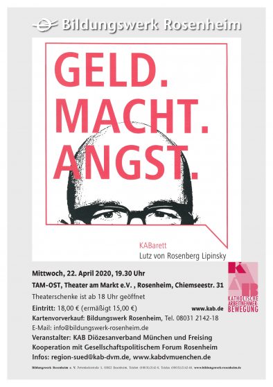 Der Eintritt beträgt regulär 18 Euro und ermäßigt 15 Euro. Kartenvorverkauf ist möglich beim Bildungswerk Rosenheim (Tel. 08031 2142-18, E-Mail: info@bildungswerk-rosenheim.de). Veranstalter ist der KAB Diözesanverband München und Freising in Kooperation mit dem Gesellschaftspolitischen Forum Rosenheim.