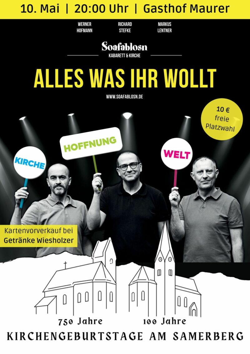 Unterhaltung und zusammen Lachen gehören ebenso zum Feiern dazu wie gemeinsame Gottesdienste – deshalb hat der Pfarrgemeinderat Törwang anlässlich des Kirchenjubiläums das Kabarett „Soafablosn“ auf den Samerberg eingeladen. Die drei Männer Richard Stefke, Markus Lentner und Werner Hofmann, alle drei selbst hauptberufliche Mitarbeiter der Kirche, bringen in ihrem neuen Programm „Alles was ihr wollt“ viele Themen der letzten Jahre sowie aktuelle Themen ein und setzen sich auf humoristische, aber auch kritische Art und Weise mit diesen auseinander.