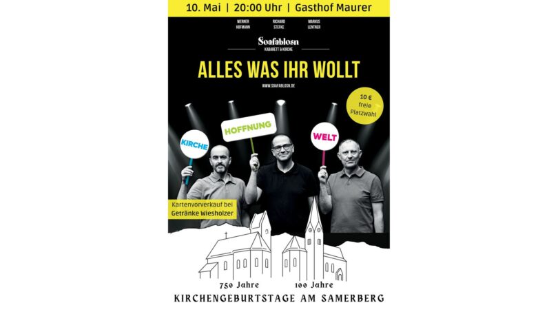 Kirchenkabarett beim Gasthof Maurer – Eine der nächsten großen Veranstaltungen im Rahmen der Samerberger Kirchengeburtstage wird das Kirchenkabarett am 10. Mai um 20 Uhr im Saal des Gasthof Maurer in Grainbach sein.