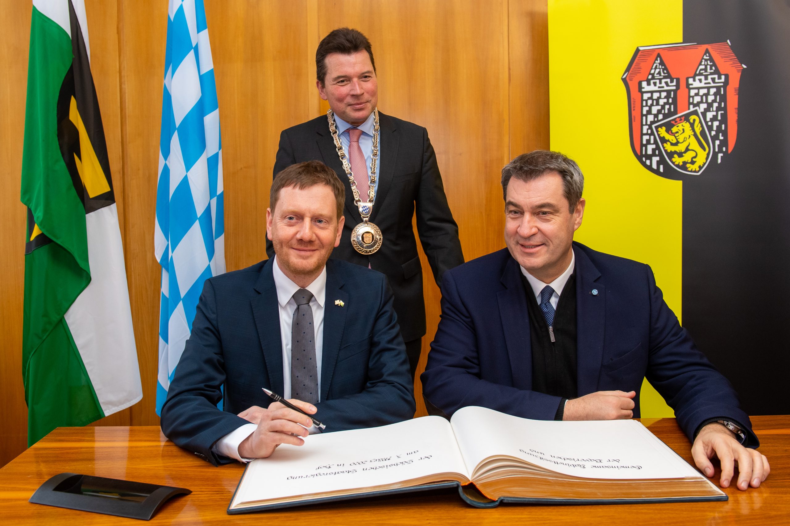 Sachsens Ministerpräsident Michael Kretschmer (links) und Bayerns Ministerpräsident Dr. Markus Söder, MdL (rechts), tragen sich im Beisein des Oberbürgermeisters der Stadt Hof, Dr. Harald Fichtner (Mitte), in das Gästebuch der Stadt Hof ein.