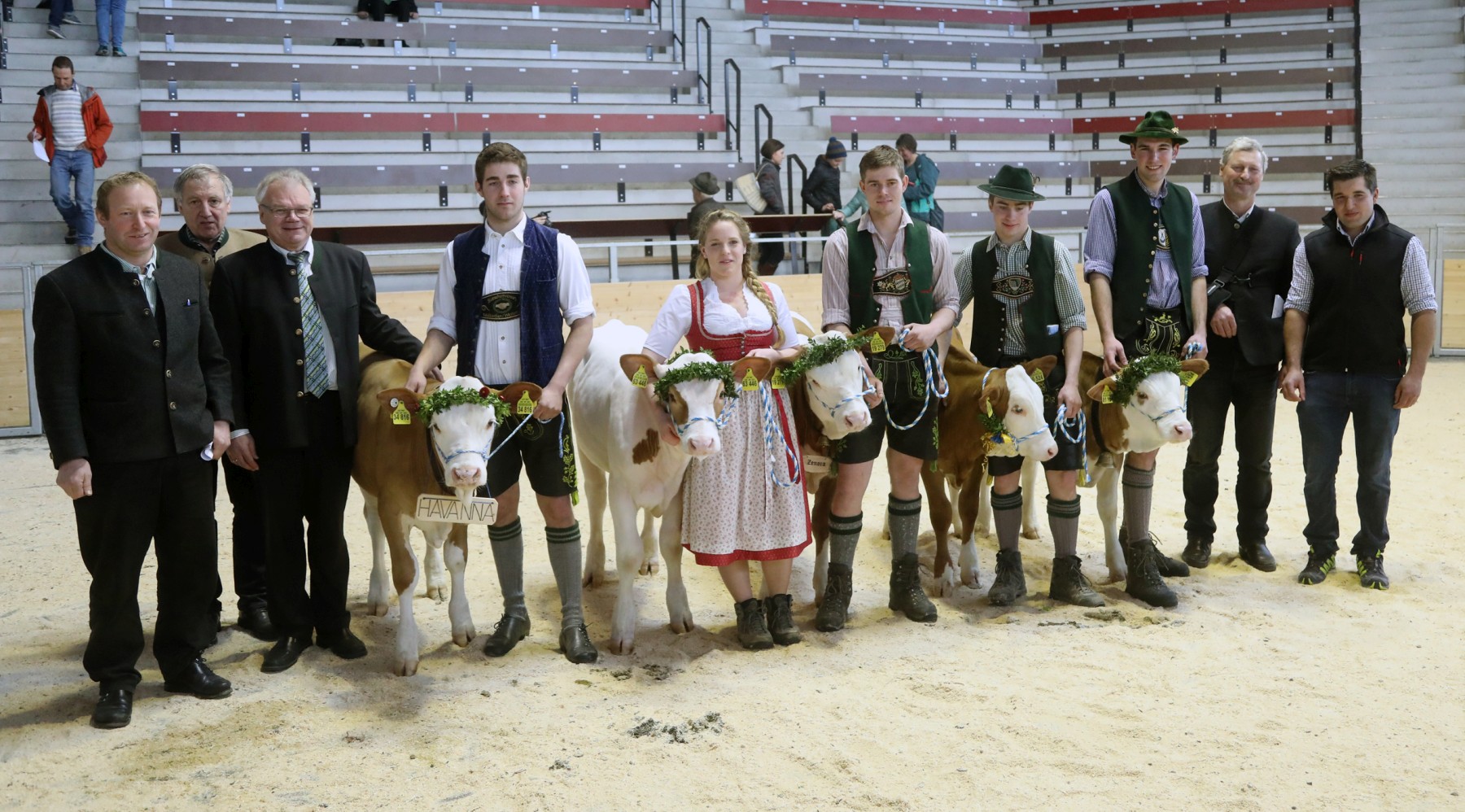 Die Sieger des Rosenheimer Kälberaufzuchtwettbewerbs mit ihren Tieren (4. v.l.): Lukas Wimmer, Thekla Elisabeth Elpelt, Manuel Gollinger, Bernhard Niederthanner und Martin Pichler. Beeindruckt vom Niveau des Wettbewerbs gratulierten (v.l.): Der Vorsitzende des Zuchtverbands Miesbach Johann Rauchenberger, der Miesbacher Zuchtleiter Dr. Franz Gasteiger, Landwirtschaftsdirektor Georg Baumgartner sowie (v.r.) der Vorsitzende der Rosenheimer Jungzüchter Korbinian Rödig und BBV-Kreisobmann Josef Bodmaier. Foto: Krinner