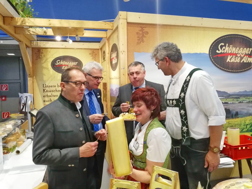 Als Heimat der Genüsse präsentiert sich derzeit Bayern auf der Internationalen Grünen Woche in Berlin. In der eigenen Bayernhalle können die Besucher der weltgrößten Ernährungsmesse noch bis Sonntag, 27. Januar entdecken und probieren, welche kulinarischen Genüsse und unvergleichlichen Spezialitäten der Freistaat zu bieten hat. Auch die Schönegger Käse-Alm aus Prem im Landkreis Weilheim-Schongau ist heuer unter dem Berliner Funkturm mit von der Partie. Landwirtschaftsministerin Michaela Kaniber schaute dabei ebenso am Stand der Heumilch-Spezialisten vorbei wie Bundeslandwirtschaftsministerin Juliane Klöckner und der CSU-Landesgrppen-Vorsitzende im Deutschen Bundestag Alexander Dobrindt. Vom bisherigen Messegeschehen und Besucher-Interesse zeigten sich Käse-Sommelière Roswitha Boppeler und deren Ehemann Alexander Holdenried bei ihrer Vermarktung der feinen Käseschmankerl.