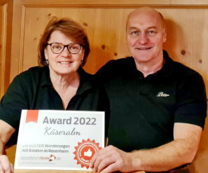 „Die besten Wanderungen mit Kindern in Rosenheim“ – nach diesem Motto sucht die Internetplattform OVB24 in Rosenheim mit ihrer Leser- und Kundschaft die familienfreundlichsten Wanderwege und Einkehrstätten. Den begehrten Award 2022 bekam – im übrigen zum 5. Mal – zum Jahresschluss die Käseralm nahe der Mittelstation der Hochriesbahn auf dem Samerberg.