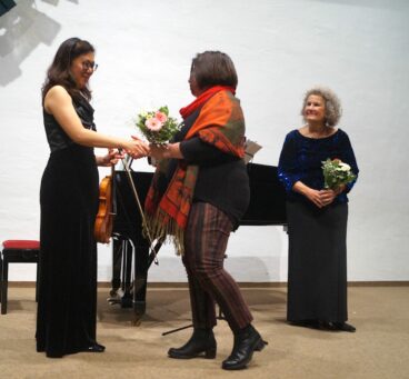292: Kulturvereinsvorsitzende Edith Karnowski bedankt sich bei Geigerin Wonji Kim-Ozim (links) und Pianistin Gerda Guttenberg-Bastian.