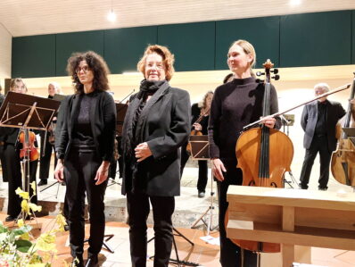 In der Sinfonia concertante in A-Dur des Bach-Sohns Johann Christian Bach (1735-1782) mit den zwei Sätzen „Andante di molto“ und „Rondeau: Allegro assai“ ersetzte der Klang der beiden Blockflöten von Dr. Cornelia Fischer-Hüttl und Sibylla Hinderling wunderbar die Oboen. Die Solovioline spielte brillant Hildegard Ruf, die sich mit dem Solocello von Monika Gaggia inhaltsvolle Dialoge lieferte und ihre virtuos-perlenden Melodien bei der Kadenz am Ende des ersten Satzes von den samten-singenden Tönen des Cellos umschmeicheln ließ. Beide Solistinnen erfreuten in dieser „Sinfonia concertante“ wie in einem Doppelkonzert für Violine und Violoncello. Die spritzigen Melodien im Rondeau erinnerten fast an ein Scherzo und ließen die Solistinnen immer wieder – besonders im mehrmals wiederholten A-Teil – klangvoll hervortreten.