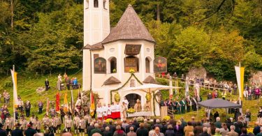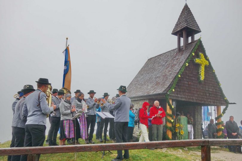 Während ganz Deutschland im Spätherbst seiner Toten gedenkt, wird im Chiemgau darüber hinaus seit nunmehr 68 Jahren am letzten Sonntag im August an alle Opfer der beiden Weltkriege erinnert. Die Gedenkfeier wird mit einem Berggottesdienst am Fuße des als Mahnmal fungierenden Gipfelkreuzes auf der Kampenwand von den ansässigen Veteranenvereinen im Wechsel mit einer hiesigen Gemeinde ausgerichtet. 2019 wird die Gemeinde Grabenstätt mit dieser ehrenvollen Aufgabe betraut. So wird am 25. August vor der Gedächtniskapelle „Maria, Königin des Friedens“ östlich der Steinlingalm um 10.30 Uhr eine Bergmesse abgehalten. Angesichts der traumhaften Kulisse sowie der Mitwirkung einer Vielzahl von Fahnenabordnungen, Gebirgsschützen und Musikern, welche die Gedenkfeier begleiten, wird diese Veranstaltung zu einem außergewöhnlichen Ereignis. Seit 1951 thront das eiserne Gipfelkreuz, dank zahlreicher freiwilliger Helfer, auf der schmalen Plattform des 1664 Meter hohen Ostgipfels der Kampenwand und wird seit 2003 durch eine Solaranlage an ausgesuchten Tagen, weithin sichtbar, beleuchtet. Bei sehr schlechtem Wetter wird die Messe in die Pfarrkirche Aschau verlegt. Die Kampenwand-Seilbahn fährt bereits ab 7 Uhr morgens; bis 9.30 Uhr gibt es anlässlich der Messe vergünstigte Tarife.