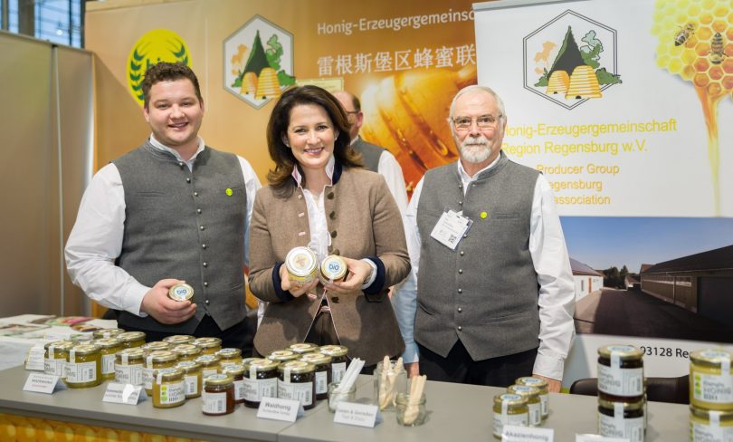 Einen Löffel Bio-Waldhonig aus der Regensburger Region ließ Landwirtschaftsministerin Michaela Kaniber bei ihrem Messerundgang über die BIOFACH in Nürnberg schmecken. Sebastian Prenzyna und Gerhardt Betz freuten sich über Kanibers Besuch und informierten die Ministerin Minister über die Vorzüge des Honigs aus ökologischem Anbau. Die Regensburger Honigerzeuger sind seit vielen Jahren mit ihren Biokreis-Produkten auf der Internationalen Fachmesse für Bio-Erzeugnisse dabei.