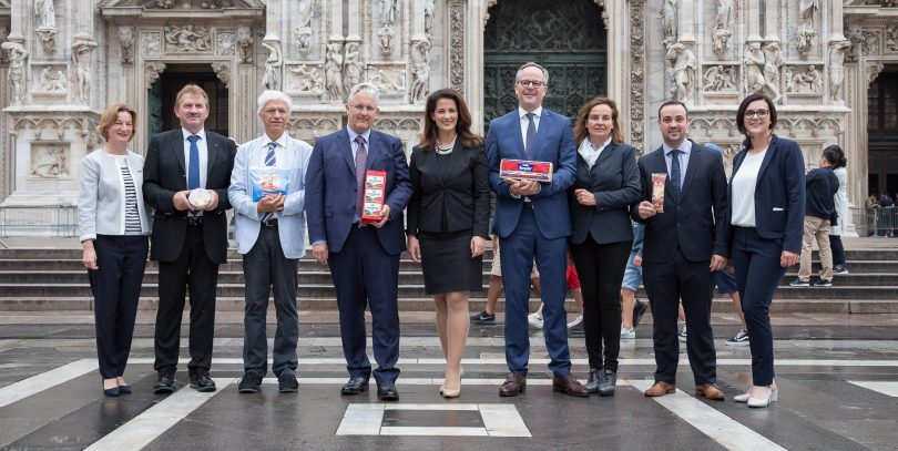 Text: Bayerisches Landwirtschaftsministerium – Fotos: Minciotti – Bildunterschrift: Das Bild zeigt Ministerin und Molkerei-Vertreter vor dem Mailänder Dom – (v.l.) Barbara Scheitz (Andechser), Ludwig Weiss, (Milchwerke Oberfranken), Hermann Jäger (Milchwerk Jäger), Thomas Siller (Bayernland), Ministerin Michaela Kaniber, Frank Forstmann (Bergader), Susanne Glasmann (milch.bayern), Alessandro Bagnato (Zott) und Carolin Babl (milch.bayern).